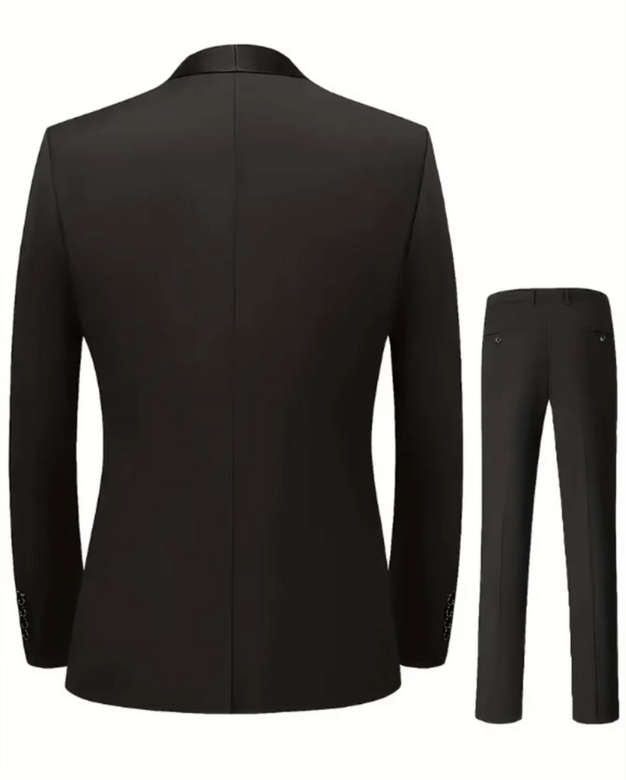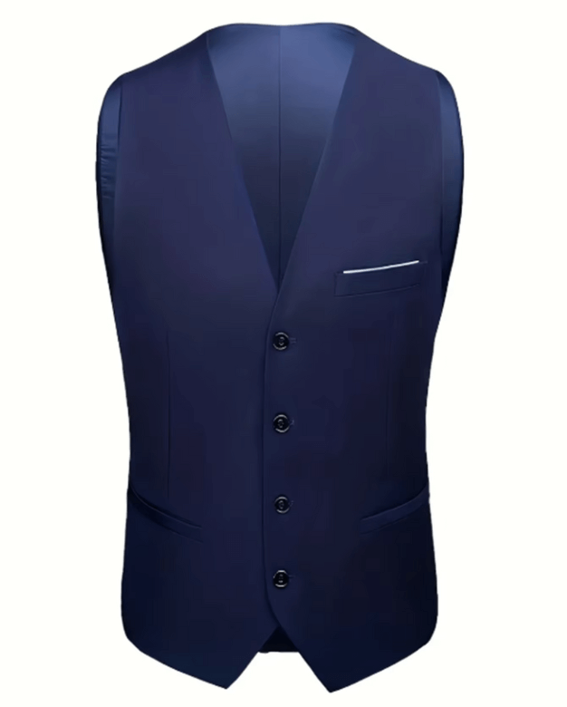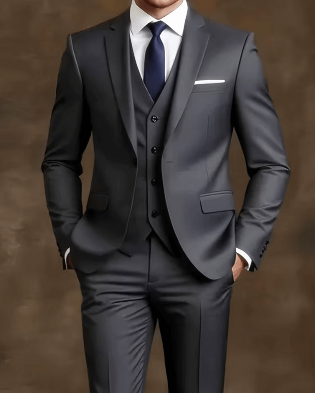 Composto por blazer, colete e calça, é ideal para ocasiões formais como casamentos, formaturas e eventos sociais.